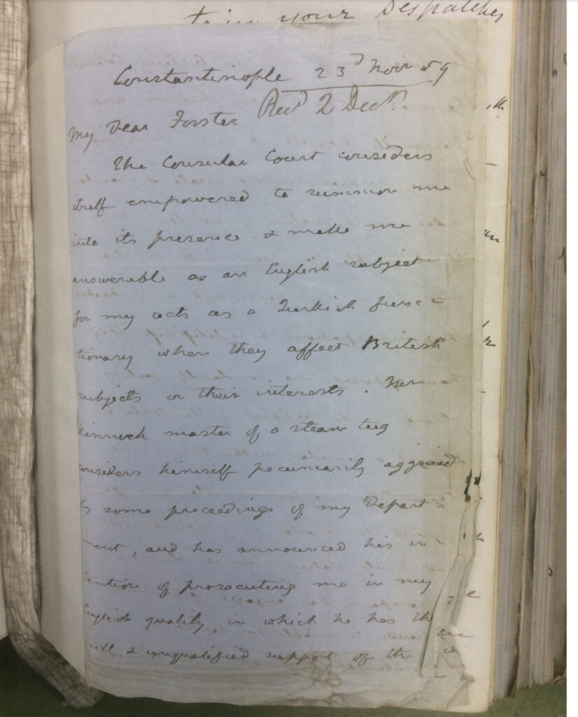 I ferreted through mundane, fascinating, and perplexing exchanges between Constantinople and London contained in printed documents, formal despatches, scribbled notes, and letters about matters before the court. In a time now dominated by the digital and virtual, handling these old papers felt visceral. Traces of the hands through which they passed were ubiquitous–stray ink drops, idiosyncrasies of penmanship, curious marginal notes, faint pencil lines for turning rough drafts into final communiques, a paint-can ring staining an official document.